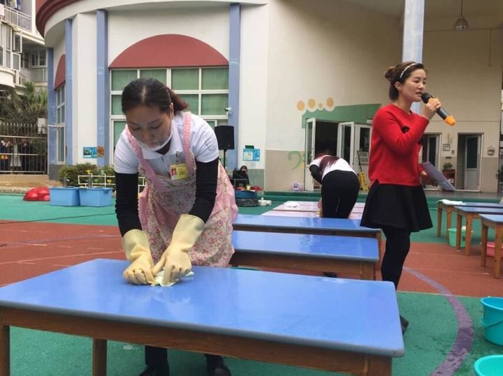 此次比賽分為兩個部分,一為知識問答環(huán)節(jié),在此環(huán)節(jié)要求保育教師在規(guī)定時間能準確無誤地回答出所抽取的理論知識題目。二為實操環(huán)節(jié),其中實操環(huán)節(jié)由消毒桌面與整理床鋪兩部分組成。 在這環(huán)節(jié)都要求保育教師在規(guī)定的時間內(nèi),能夠動作規(guī)范、熟練快速地完成。