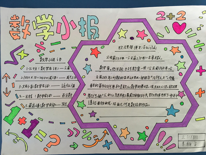 三年級:數(shù)學(xué)手抄報,通過了一張張精美的手抄報制作,讓我們走進(jìn)了數(shù)學(xué)家的故事,領(lǐng)略了數(shù)學(xué)名人的風(fēng)采,讓我們見識了數(shù)學(xué)名題、數(shù)學(xué)趣題,開拓了數(shù)學(xué)思維,讓我們了解了數(shù)學(xué)日記,打開了數(shù)學(xué)知識的大門。